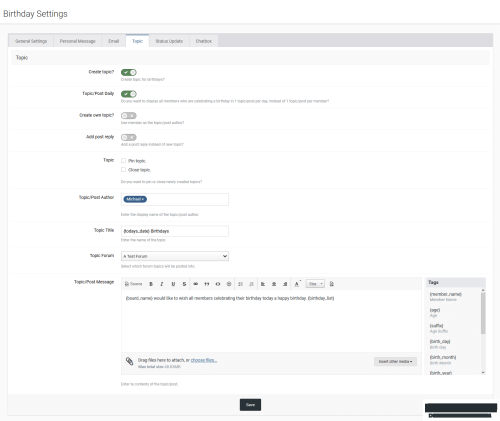 - Create new birthday topics or add replies to a "birthday topic" when there is a members birthday.