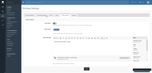 Birthday greeter that can send out birthday emails, topics, personal messages, status updates and chatbox messages to members celebrating their birthday. Included widgets to also wish members a happy birthday.